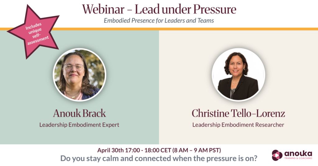 Samen met onderzoeker Christine Tello-Lorenz en leiderschapstrainer Anouk Brack verken je een Leadership Embodiment zelfscan en ervaar je een concrete oefening die je direct kunt toepassen in uitdagende situaties.